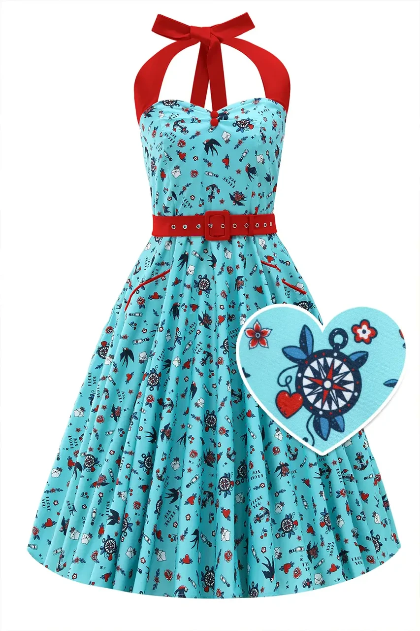 The flattering halter neckline and fitted bodice beautifully define the waist, enhanced by a belt. The over-the-knee swing skirt moves gracefully with every step, bringing out the true spirit of 50s style. A perfect choice for dancing, special occasions, or simply feeling confident in everyday wear.