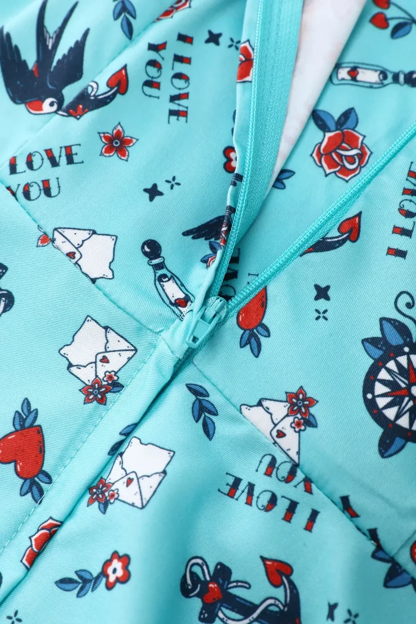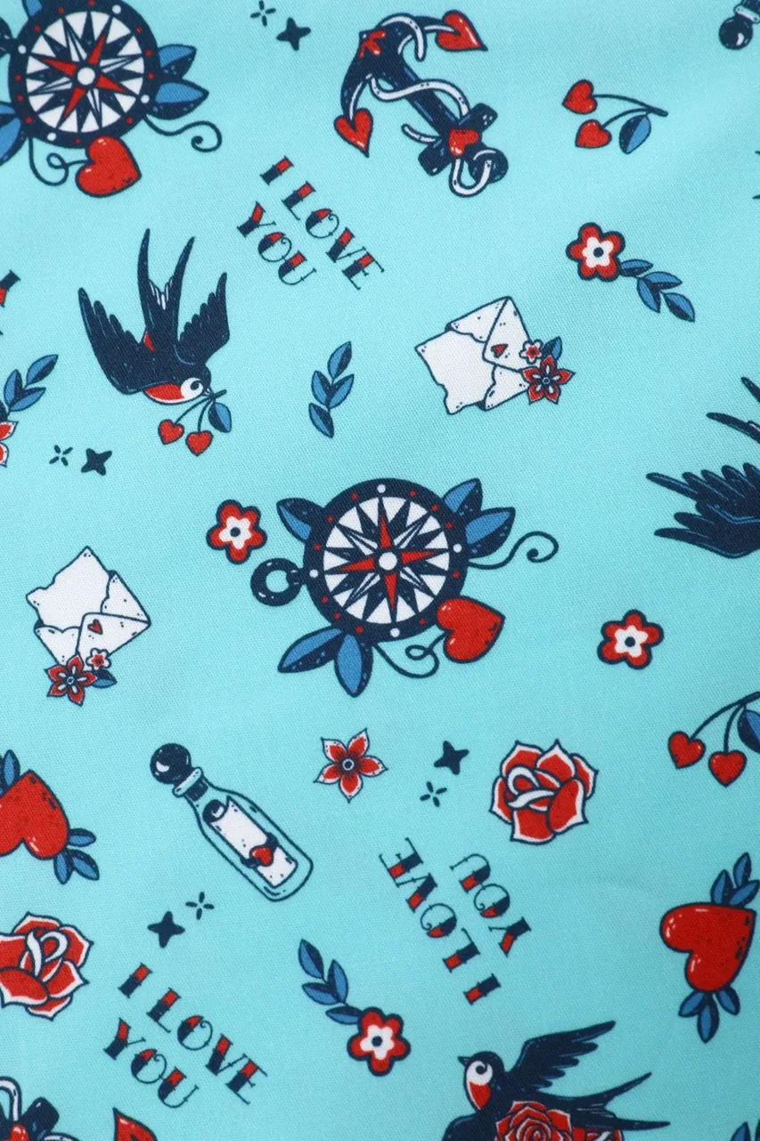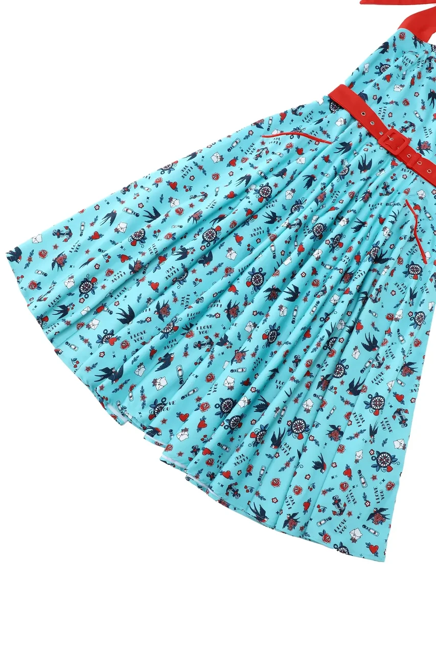 Set on a blue background, the old school nautical tattoo print adds character and a unique touch to the dress.