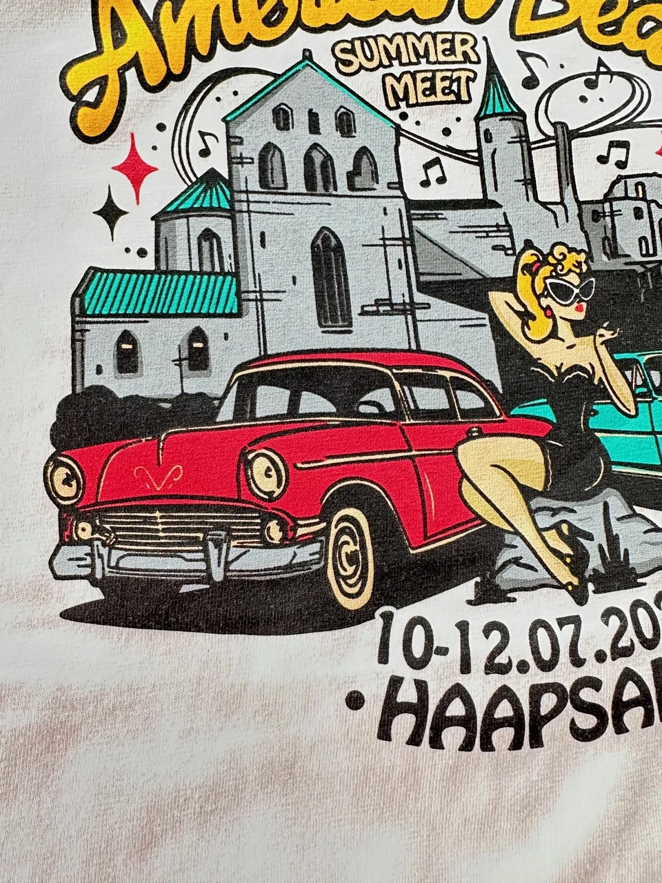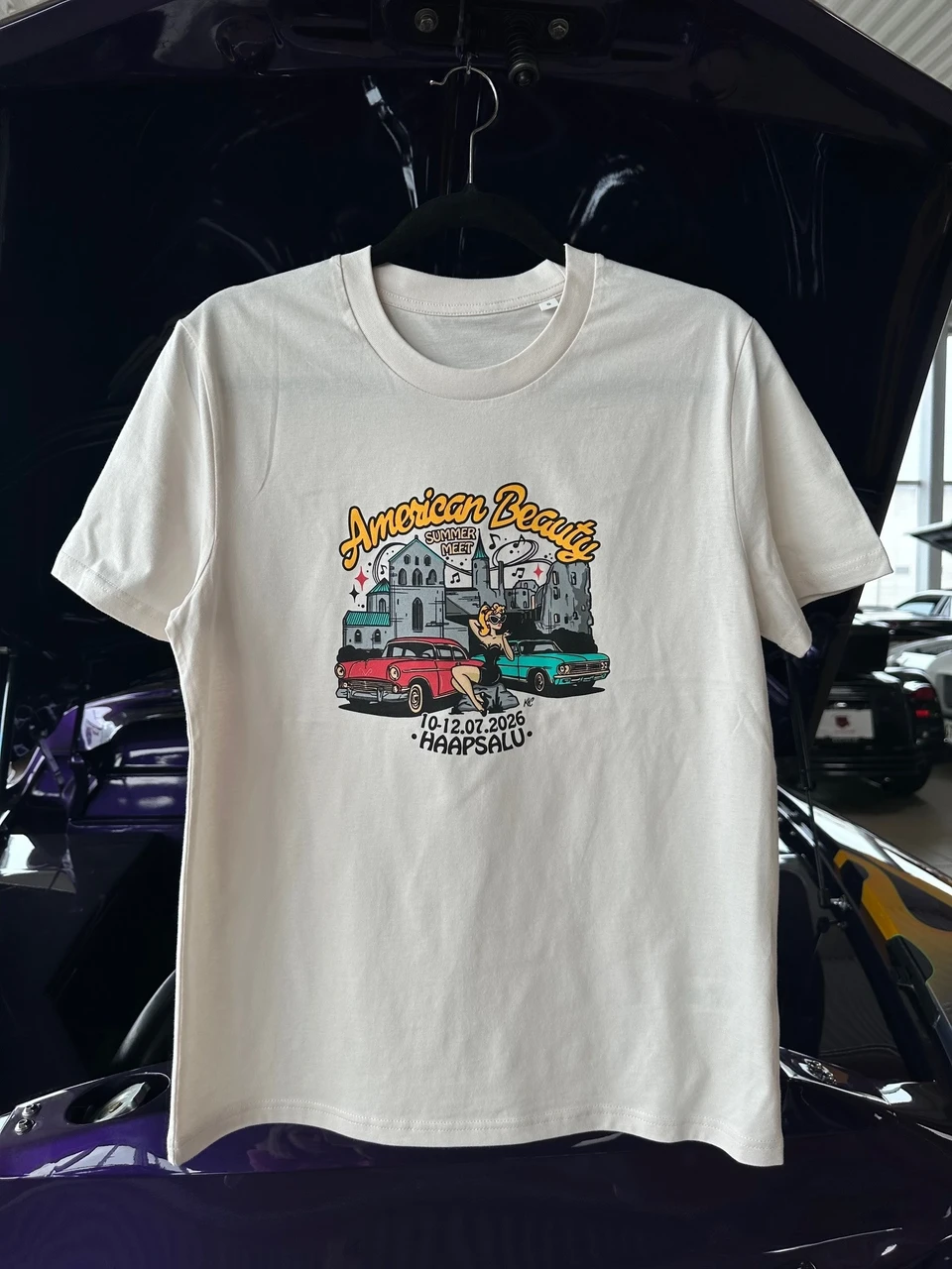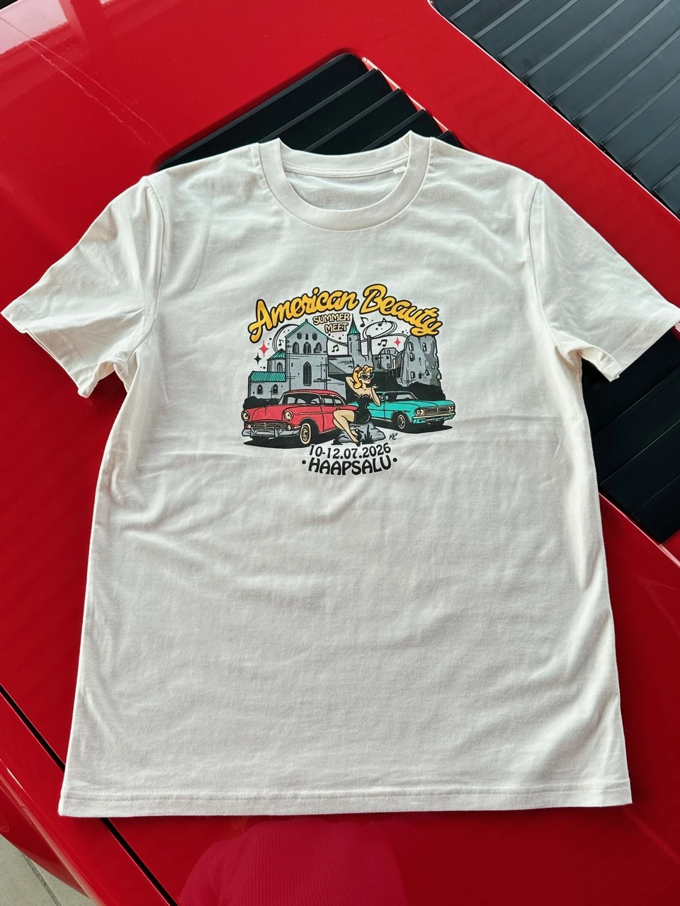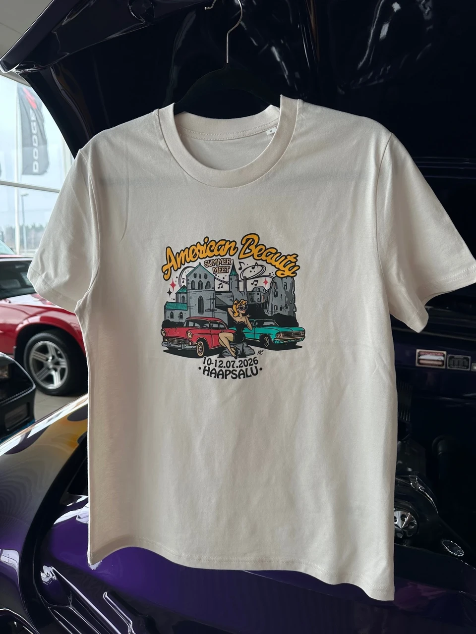 Celebrate summer and American car culture with this American Beauty Summer Meet 2026 T-shirt. Featuring a standout design by Espiga Catarina (@kittycatkustomarts, Portugal).