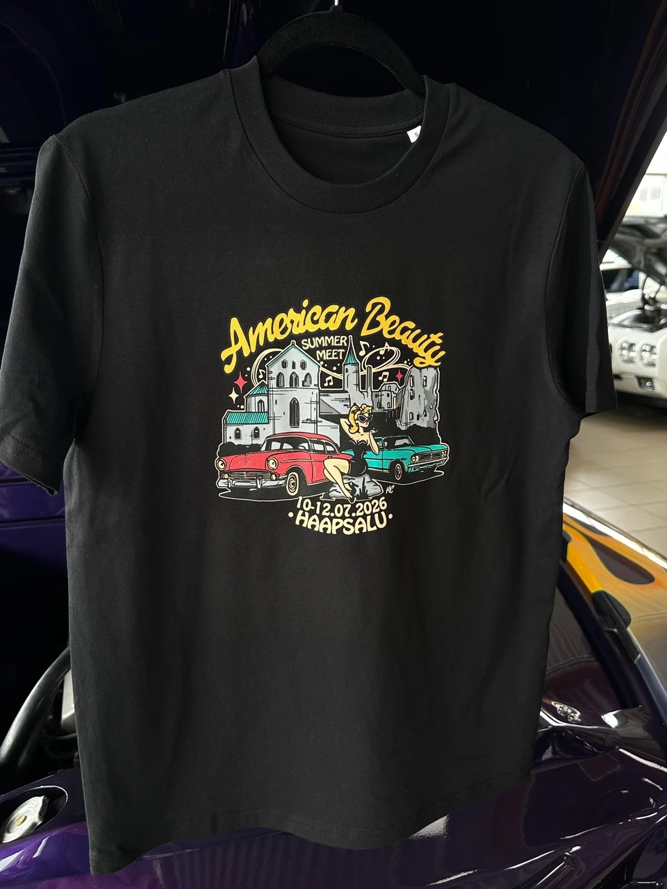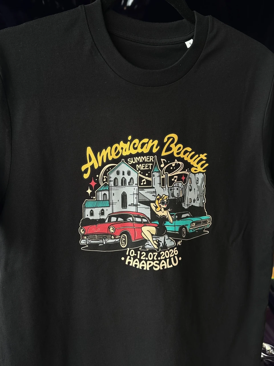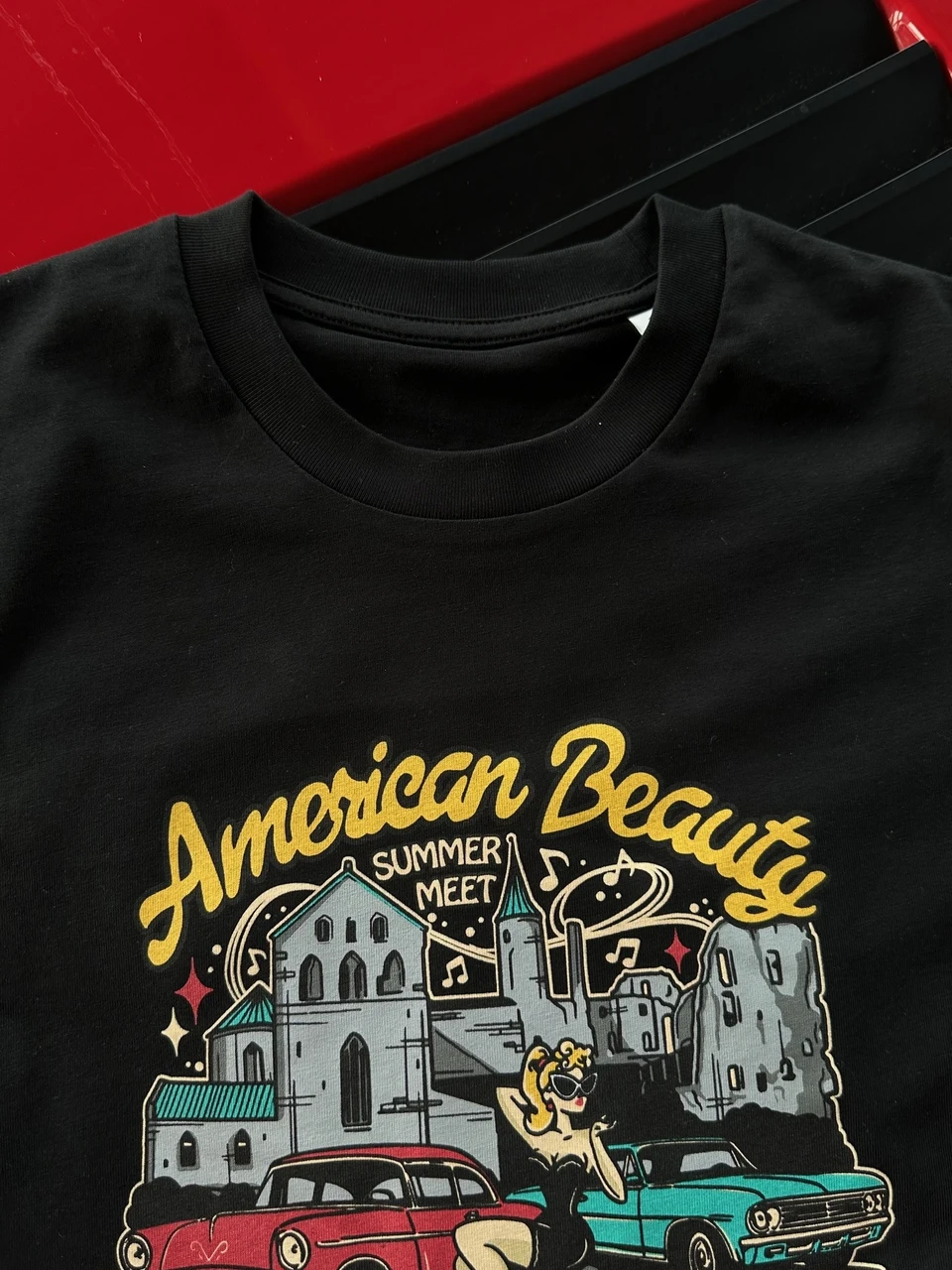 Celebrate summer and American car culture with this American Beauty Summer Meet 2026 T-shirt. Featuring a standout design by Espiga Catarina (@kittycatkustomarts, Portugal).