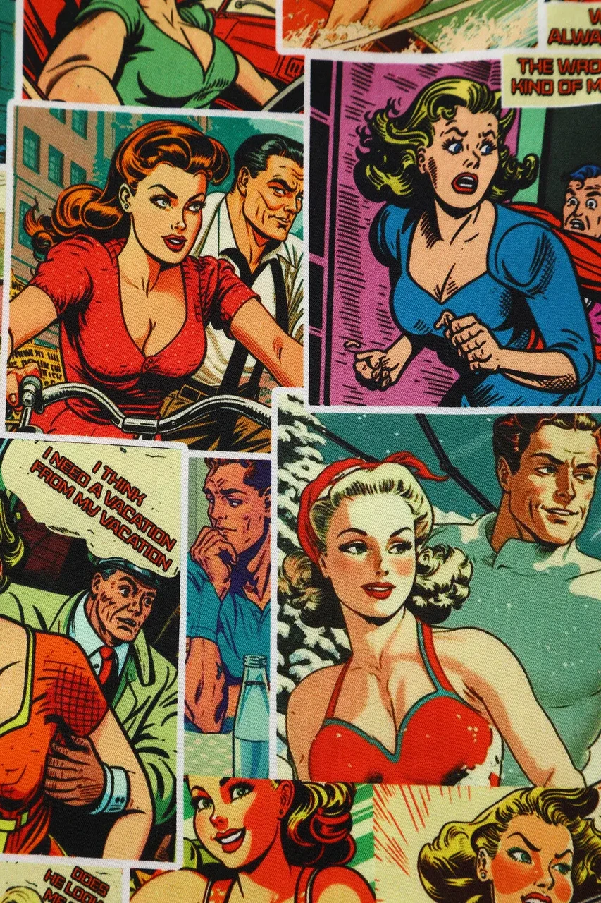 Set on a cheerful yellow background, the comic print brings energy and personality to the look. The fitted bodice and coordinating belt define the waist, while the red-lined collar and sleeves add a striking contrast. Front buttons and practical pockets complete this stylish yet functional design.
