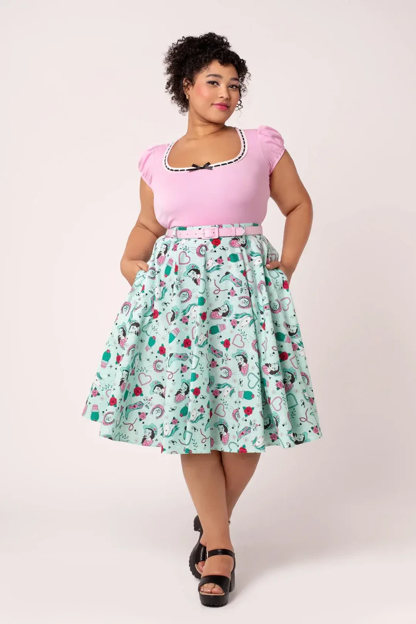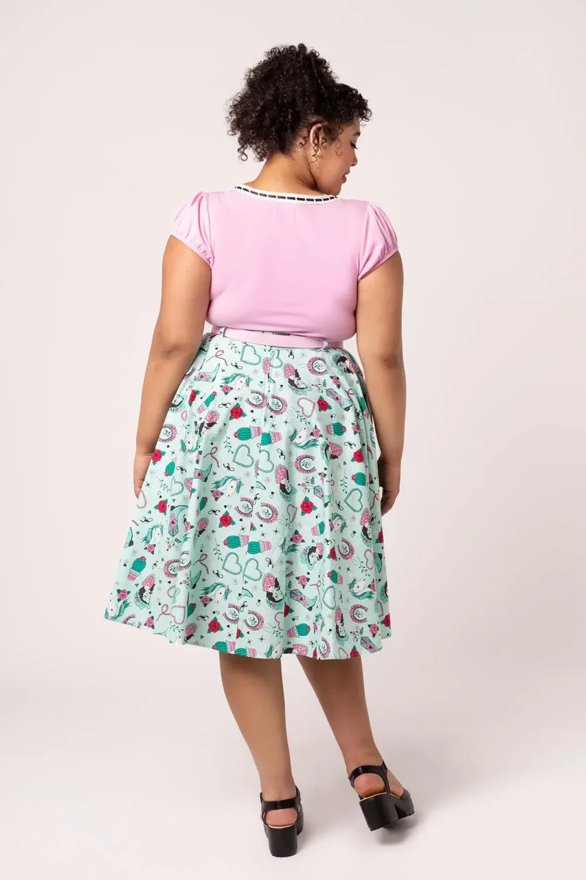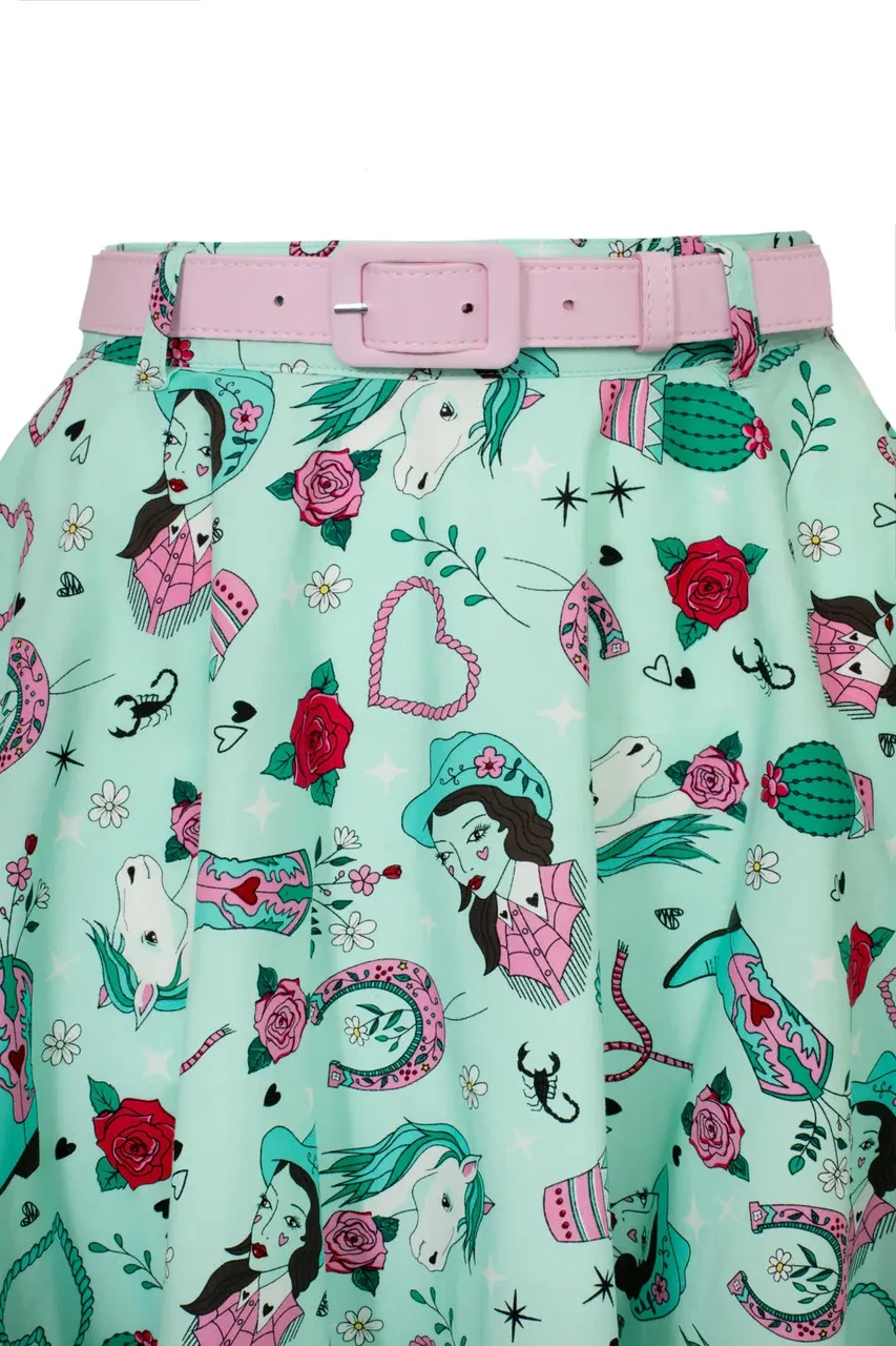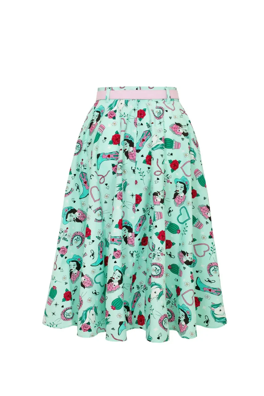 Add playful western charm to your wardrobe with the Hell Bunny Kellie Skirt. This 50s style midi skirt features a mint green base with western-inspired artwork of horses, cowboy boots, and cacti, creating a bold and unique retro look.