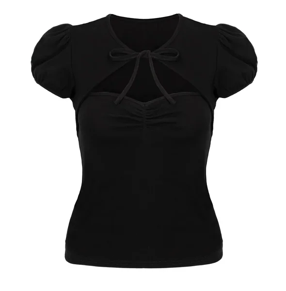 Add a touch of vintage glamour to your wardrobe with the Hell Bunny Priscilla Top. This fitted black top features feminine details that create a stylish and eye-catching look, perfect for both everyday wear and evening outfits.