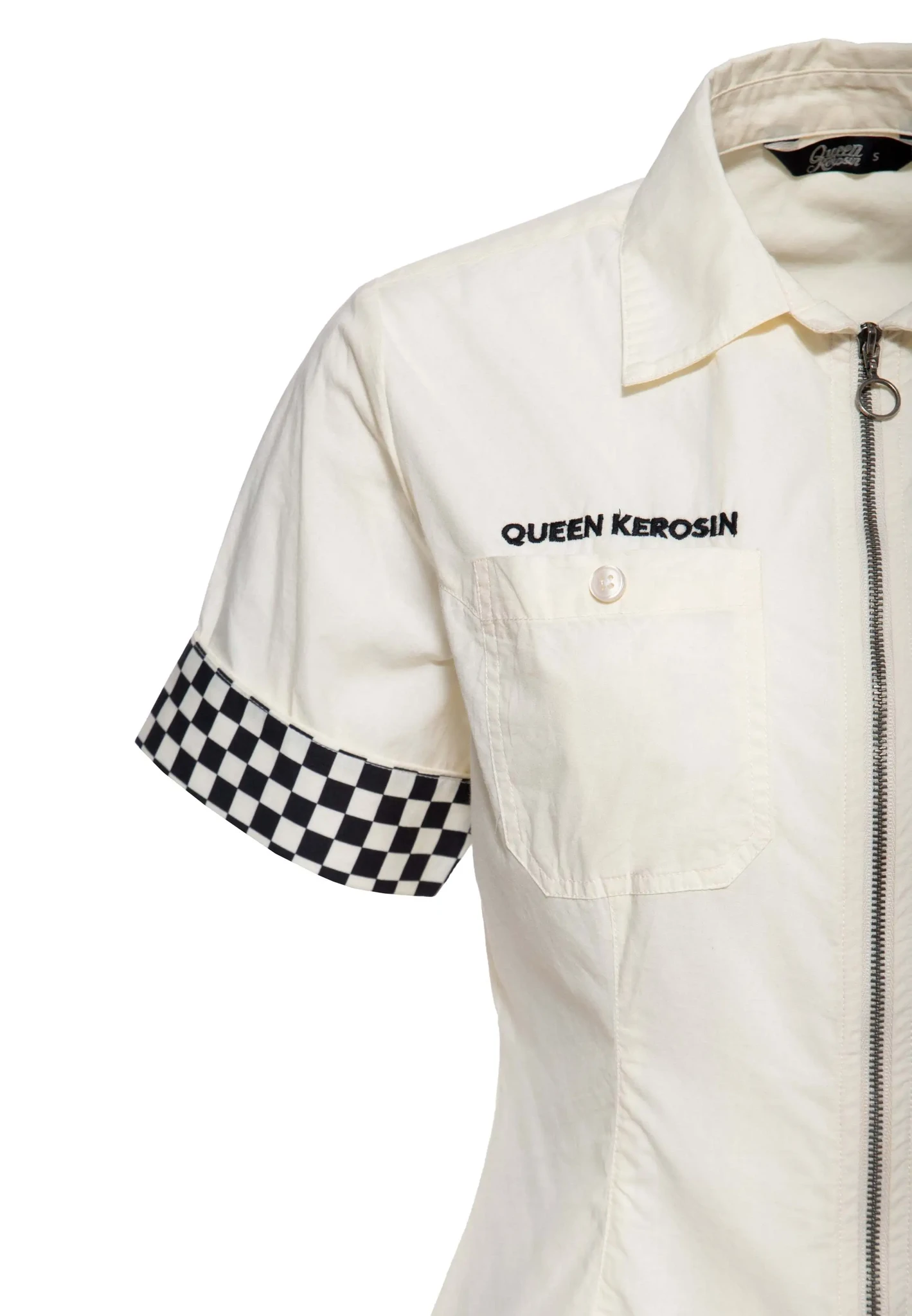 Add bold racing spirit to your wardrobe with the Queen Kerosin Super Modified blouse in offwhite. This eye-catching racing-style blouse combines retro motorsport attitude with a feminine silhouette, making it the perfect choice for those who love unique and confident fashion.