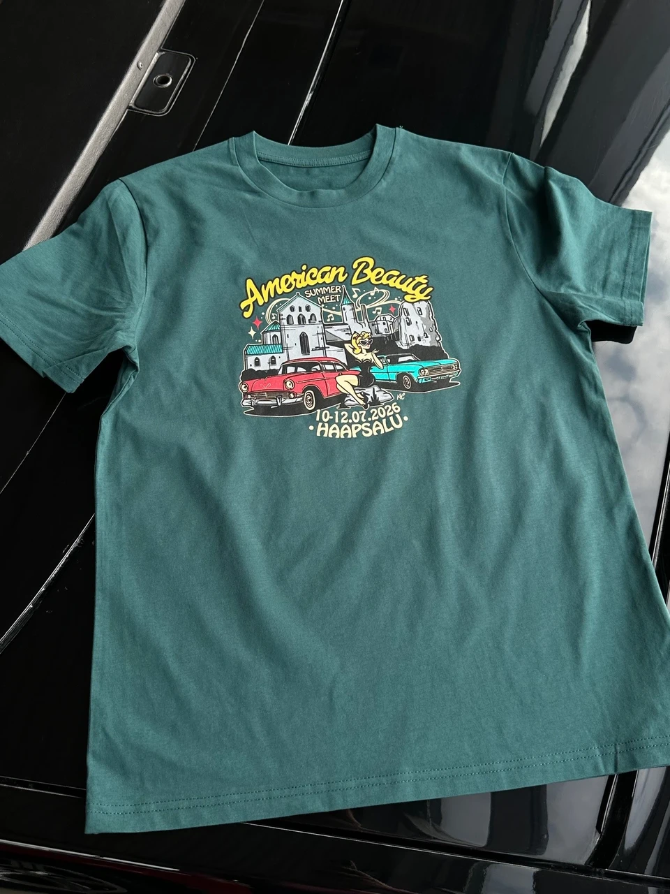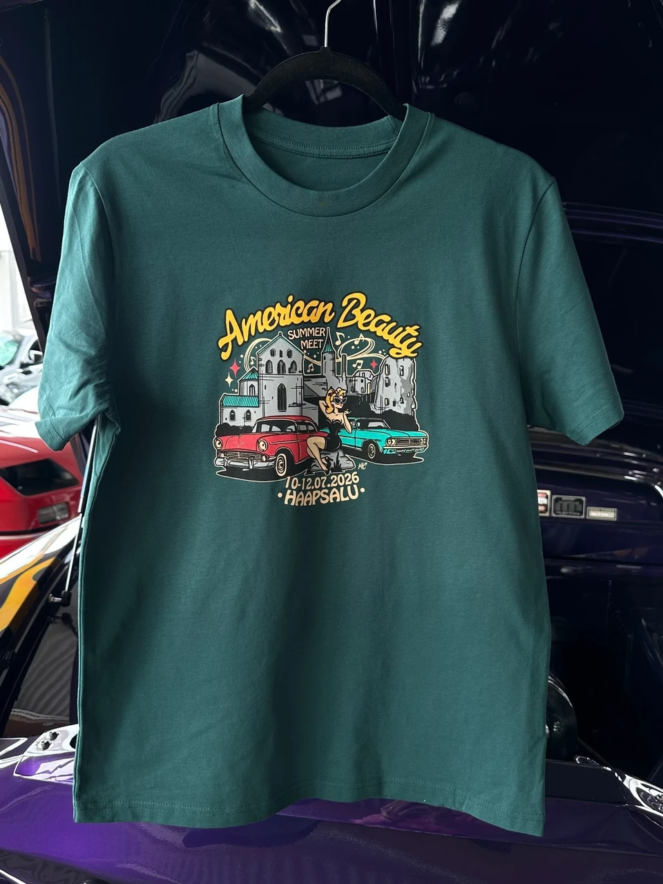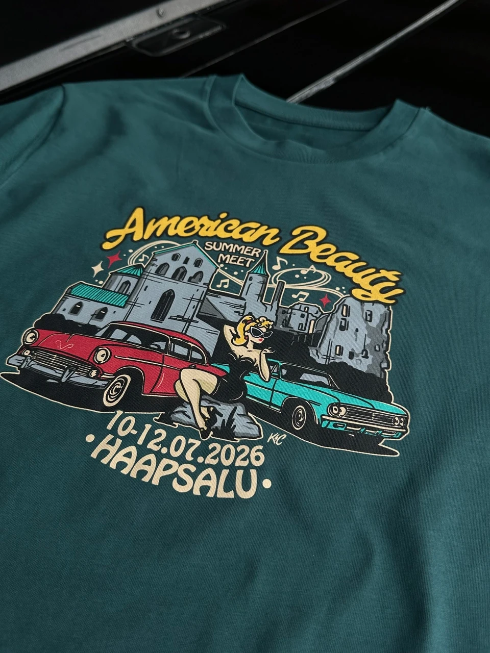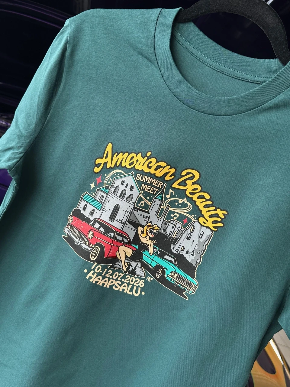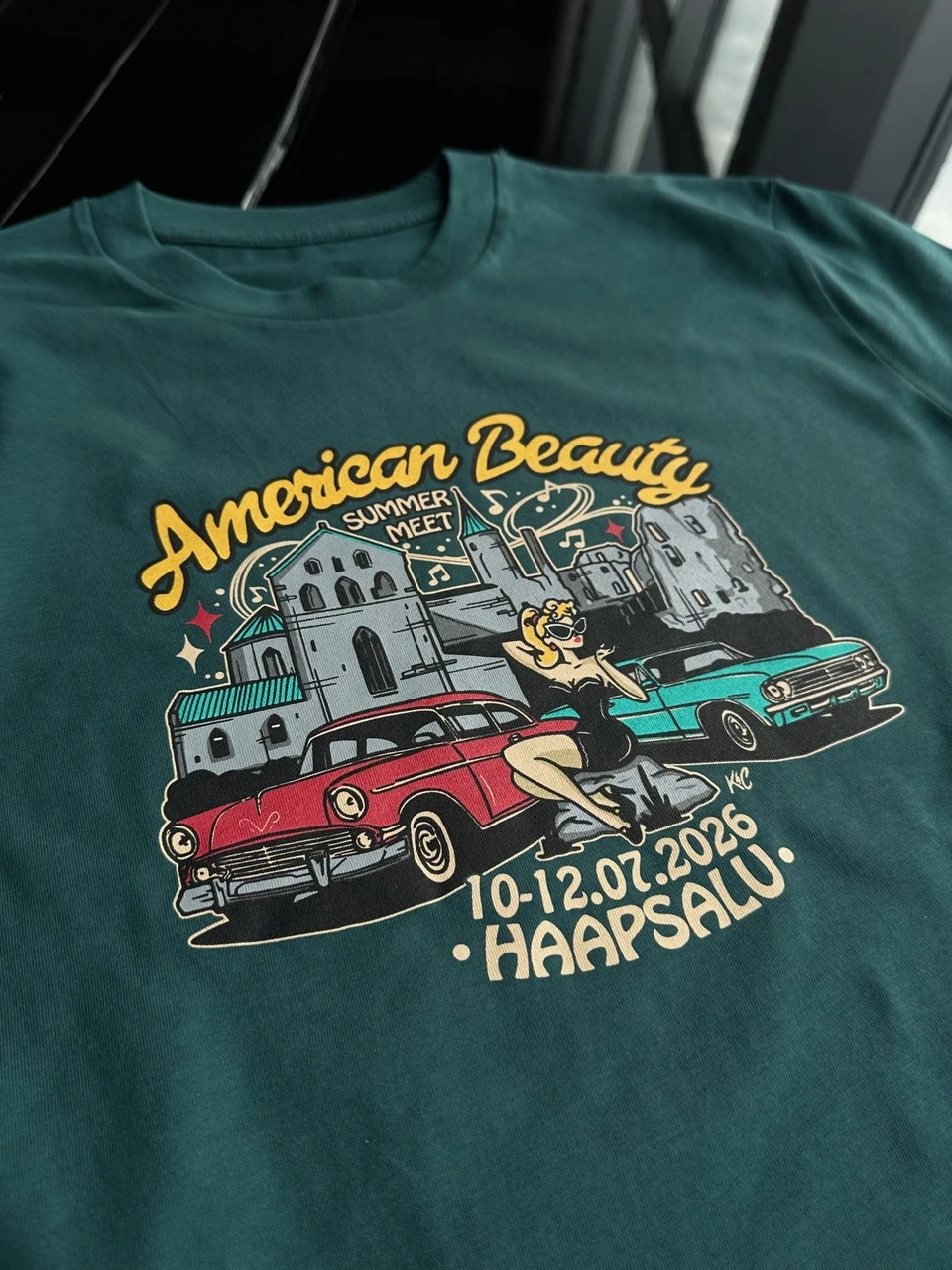 Tähista suve ja Ameerika autokultuuri selle American Beauty Summer Meet 2026 särgiga. Silmapaistev disain, mille autor on Espiga Catarina (@kittycatkustomarts, Portugal).