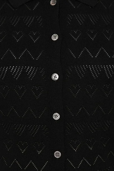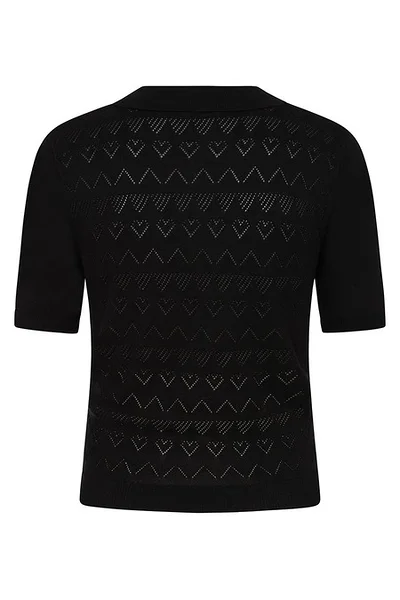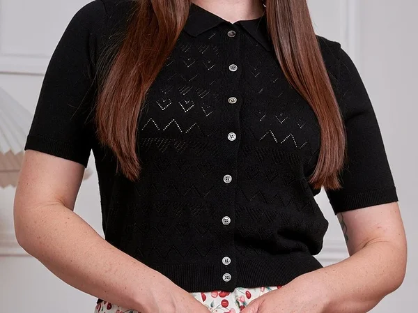 Elegantne krae ja dekoratiivne perforatsioon annavad kardiganile erilise detaili, samas kui lühikesed varrukad ja nööbid muudavad selle mugavaks ja mitmekülgseks valikuks.