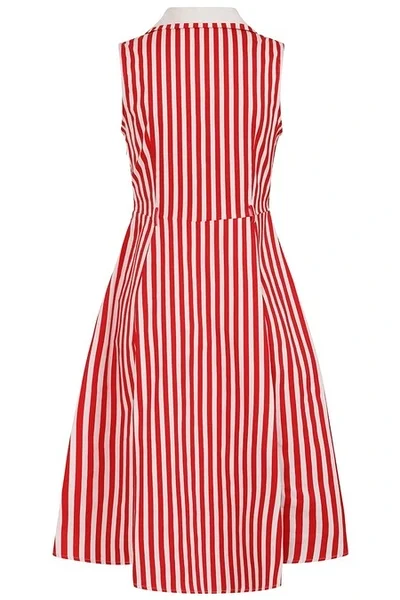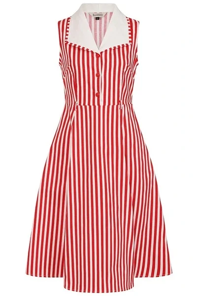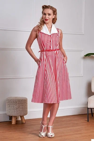 Lisa oma garderoobi ajatut vintage-stiili Banned Retro Red Genevieve triibulise kleidiga. See klassikaline varrukateta särkkleit ühendab elegantse lõike ja pilkupüüdva triibumustri, luues naiseliku ja viimistletud välimuse.