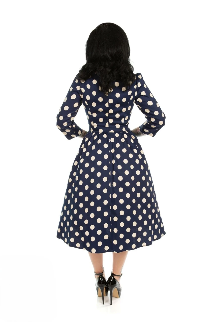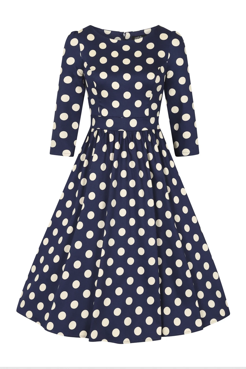 Tumesinisel taustal olevad kreemikad mummud annavad kleidile klassikalise retrohõngu. Paatkaelus ja ¾ varrukad loovad elegantse silueti, samas kui figuuri järgiv ülaosa ja taljevöö rõhutavad kaunilt taljet. Lendlev swing-seelikuosa lisab liikumist ja mugavust, muutes kleidi ideaalseks valikuks nii igapäevaseks kandmiseks kui ka pidulikemateks sündmusteks.