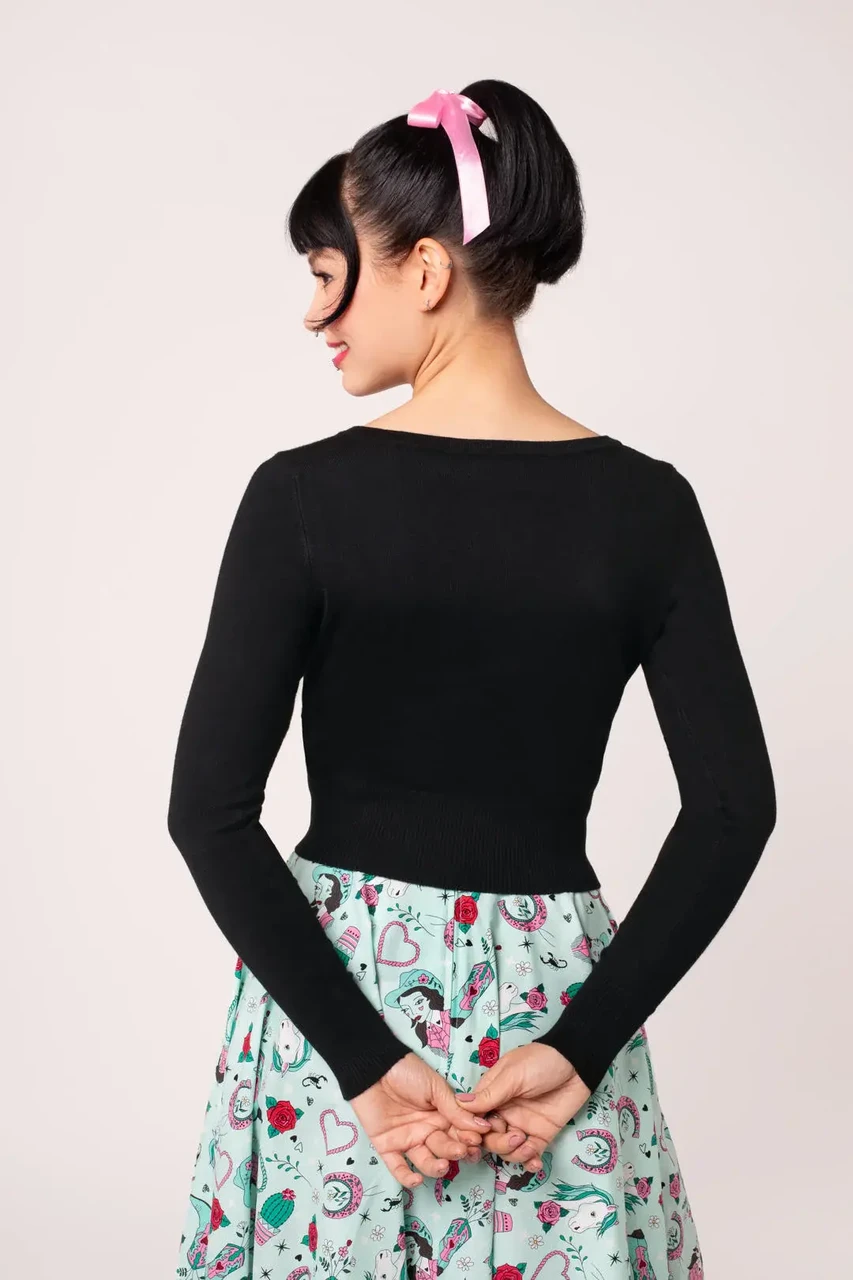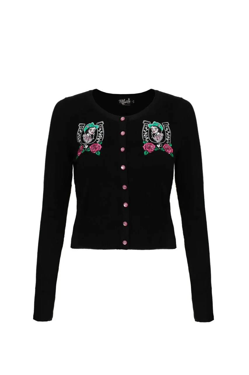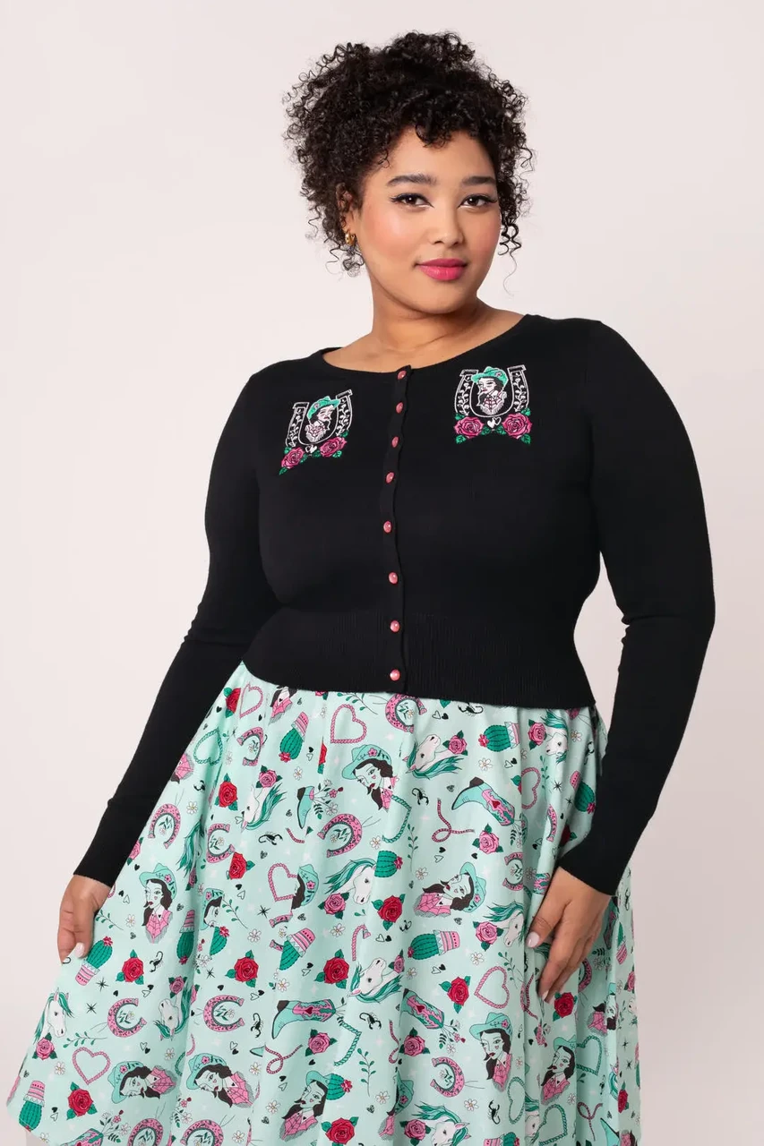 Lisa oma garderoobi mängulist western-stiili Hell Bunny Kellie kardiganiga. Pilkupüüdev tikand cowgirl’i motiiviga, mida raamivad hobuseraud ja roosad roosid, loob unikaalse ja naiseliku välimuse, mis ei jää märkamatuks.